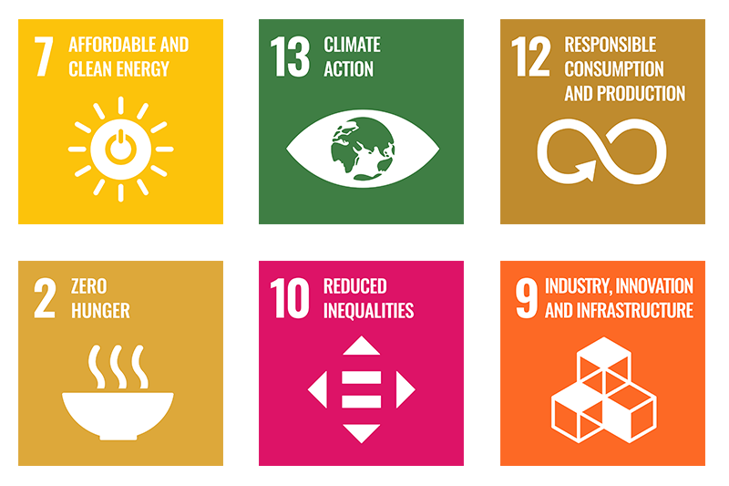 These areas have been designed to align with six of the UN Sustainable Development Goals (SGDs) - Affordable and clean energy, Climate action, Responsible consumption and production, Zero hunger, Reduced inequalities and Industry, innovation and infrastructure.